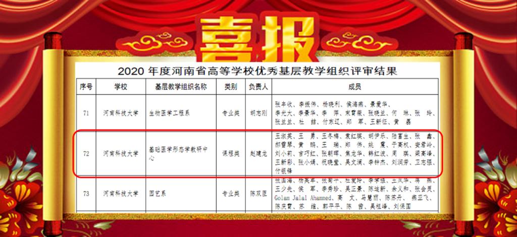 2020年8月19日,河南省教育厅公布了《2020年度河南省高等学校优秀基层教学组织》的评审结果,我院《基础医学形态学教研中心》喜获河南省高等学校优秀基层教学组织,是我院首个省级优秀教研组织,今后将继续努力,在组织建设、教学研讨、师资培养等各方面严格按照省级标准进行,真正起到示范引领作用,提高组织能力和教学水平。